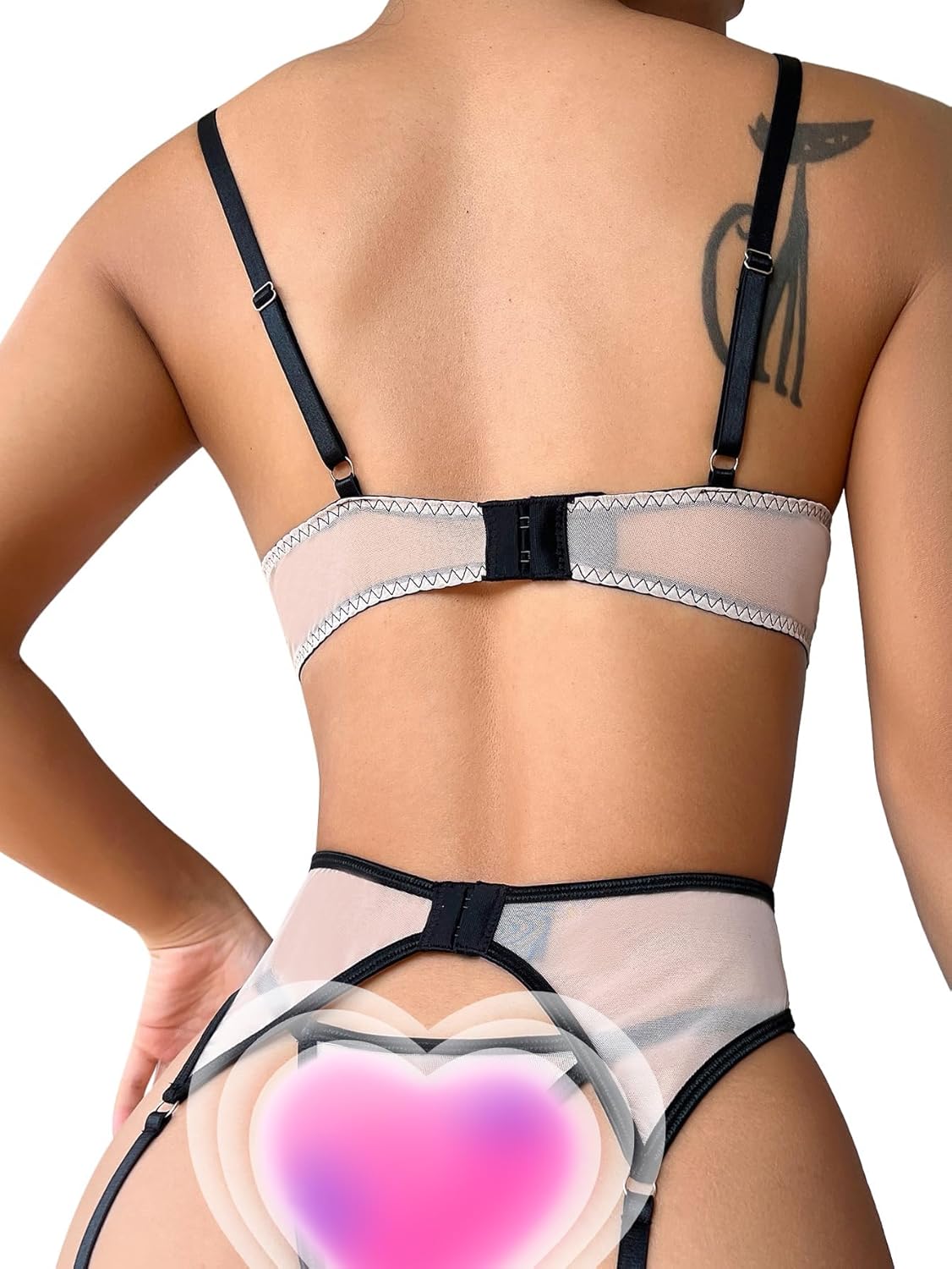 Sexy Floral Embroidery Mesh Sheer Push Up Garter Belt Lingerie Set 3 Piece