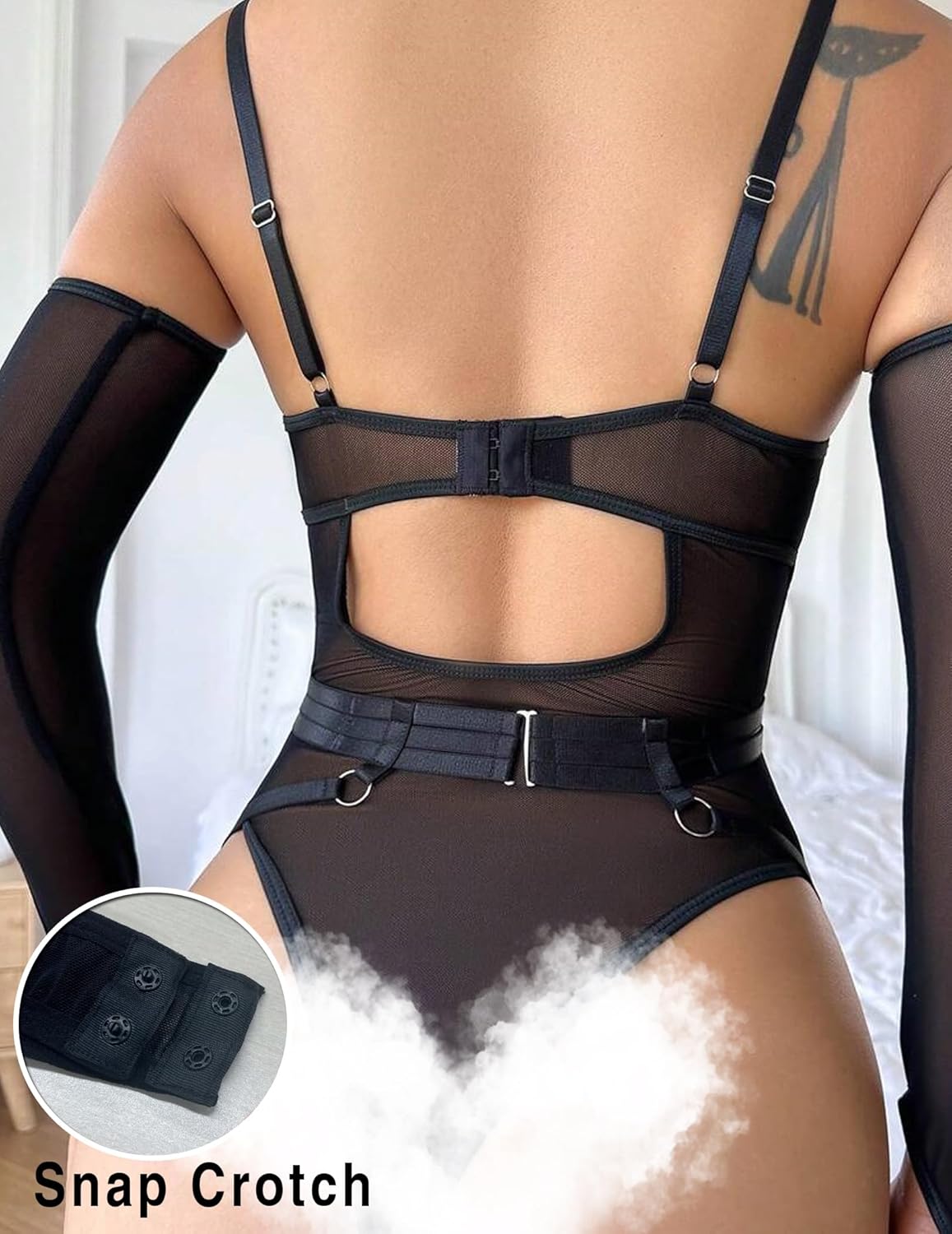 Sexy Lingerie for Women Mesh with Garter Exotic Bodysuit(Including Oversleeves)